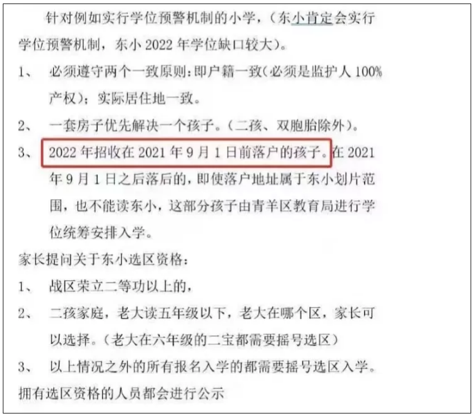 家长们告诉记者,2020年12月,东城根街小学和青羊实验中学附属小学分别召开了学位预警机制征求意见会,提出了2022年就读东城根街小学和青羊实验附小的孩子需满足落户年限满一年的要求。