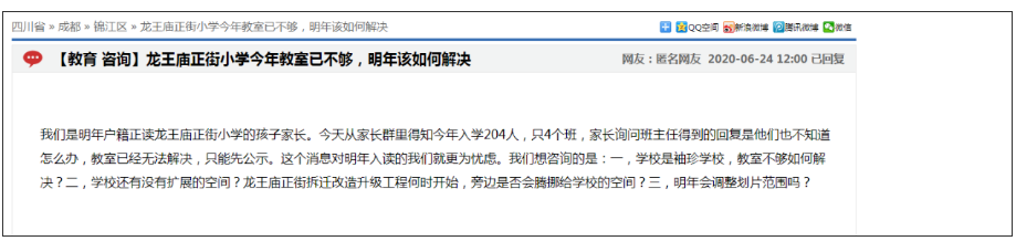 2020年,龙王庙正街小学入学人数达到204个,计划4个班,但是毕业却仅有两个班,可以想象,爆仓预警是大概率了。另外,学校教室很少,操场也不大。这让家长们有些焦虑,其中就有家长在政务网站上提问: