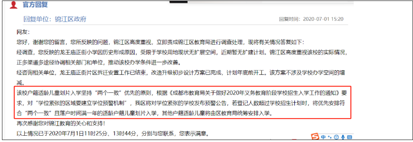 经调查,龙王庙正街小学因历史形成原因,受限于学校用地现状无扩展空间,近期暂无扩建计划。锦江区高度重视该校的实际情况,正多渠道多途径协调相关部门和单位,推动该校办学条件进一步改善。经咨询相关单位,龙王庙正街片区拆迁安置工作已结束,改造升级初步设计方案已完成,计划年底前开工。该方案不涉及学校办学空间的增减。该校户籍适龄儿童划片入学坚持“两个一致”优先的原则,根据《成都市教育局关于做好2020年义务教育阶段学校招生入学工作的通知》要求,对“学位紧张的区域要建立学位预警机制”,锦江区将对学位紧张的学校发布预警公告,若登记人数超过学校招生计划时,将优先安排符合“两个一致”且落户时间满一年的适龄户籍儿童划片入学,其他户籍适龄儿童将由区教育局统筹安排入学。