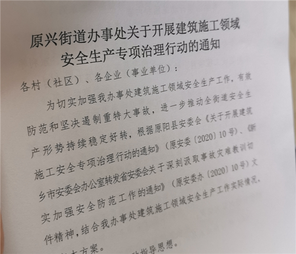 4月19日下午,记者从原阳县官方渠道获悉,事发前的4月10日,盛和府小区所属的原兴街道办事处下发了《关于建筑施工领域安全生产专项治理行动的通知》,对全办事处范围内在建的各类建设工程项目,进行安全生产专项治理,行动时间为4月10日至5月8日。