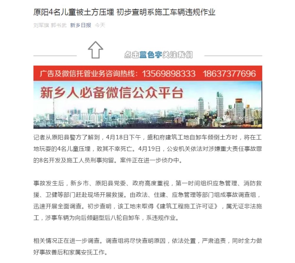 记者从原阳县警方了解到,4月18日下午,盛和府建筑工地自卸车倾倒土方时,将在工地玩耍的4名儿童压埋,致其不幸死亡。4月19日,公安机关依法对涉嫌重大责任事故罪的8名开发及施工人员刑事拘留。案件正在进一步侦办中。