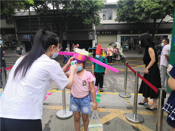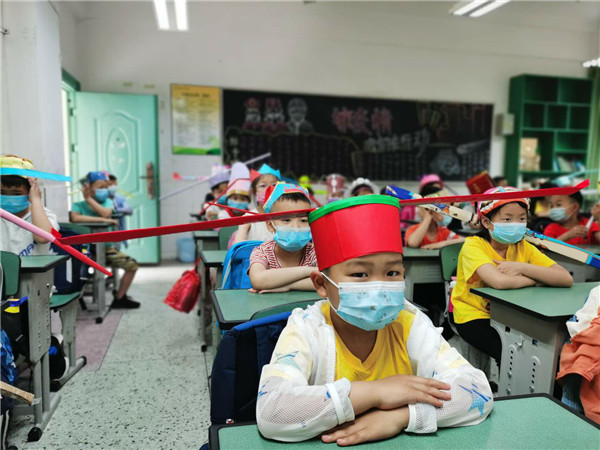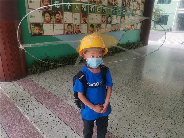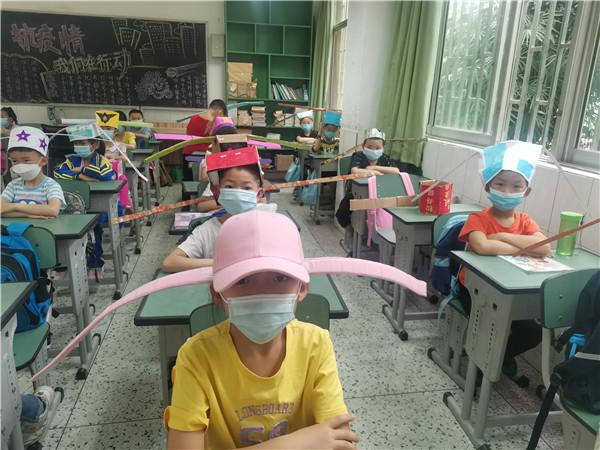 据悉,为了让一年级的孩子们对于“一米”有明确的空间概念,在生活中学到数学知识,提高学生的动手能力,养成良好的卫生习惯,与他人保持一米的安全距离,胜利小学的老师们精心设计了让孩子们在家和父母一起动手做“一米帽”的活动。“头戴一米帽、保持一米距”。开学第一天戴着帽子到学校,不能碰到他人的,也不能损坏自己的。孩子们戴上帽子,有序到校复课。记者在现场看到,每个孩子的帽子都不一样,有降落伞式的造型,能够充分理解到一米的间隔;有帽子是变废为宝,将生日帽和“一米帽”充分的结合起来,高端大气上档次……