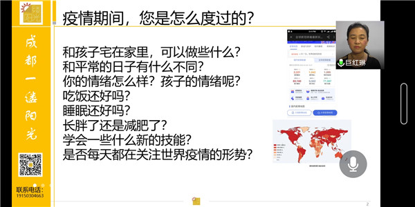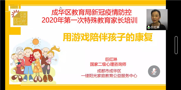 长期宅家抗“疫”,空间有限,社交缺乏,容易引起人们系列心理、情绪、行为问题,对特殊儿童及家长而言,其挑战性更大。为引导区域残障孩子及家长在疫情期间科学应对可能出现的认知、情绪、行为、躯体上应激反应,尽量做到及早预防、及时疏导、有效干预,最大限度地减轻疫情带来的心理伤害,最大范围地提供心理支持服务工作。在第三十个全国助残日即将来临之际,5月7日晚19:30-21:00,成华区特殊教育资源中心邀请成都市一缕阳光负责人巨红琳老师为全区特殊学生家长、随班就读教师和特殊教育学校班主任开展主题为《用游戏陪伴孩子的康复》的线上专题培训活动。