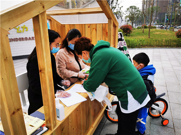 各班家长按约定时间如约来到幼儿园门口,按照操作流程借书。这是长假以来第一次的见面,虽然暂时还不能拥抱,但在那一刻的微笑与对视中,在亲切的问候中,学校与家庭用这种方式走近彼此。