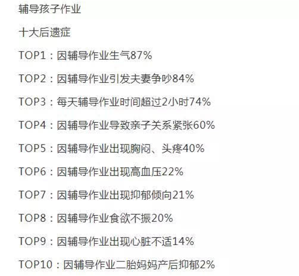 疫情之前,一篇《十大家长辅导作业“后遗症”》的文章在朋友圈刷屏。这份报告显示:陪孩子学习,辅导孩子作业的主力军是30-40岁的“中年老母亲们”,这些身负重任的老母亲们也因为焦虑产生了各种“后遗症”。
