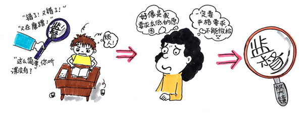 这样做不仅干扰了孩子学习的节奏,也让孩子有一种被监视、不自由的压抑感。在反复地指责中,孩子的不足又被反复强调,很容易让孩子给自己下定义——我就是一个磨蹭的小孩,我就是上课没听讲,我就是比别人差。负面信息的强化是不利于孩子健康发展的。随着年龄的增长,家长觉得孩子越来越难管理,就是因为这时的孩子开始试着挑战家长的监督,一旦孩子发现家长的无能为力,他就会爆发式的反弹,不仅影响学习,也会造成尖锐的亲子矛盾。