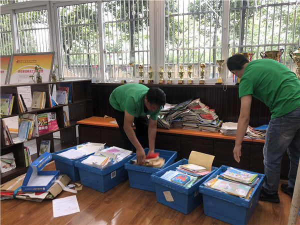 5月21日上午,新华文轩“一木环保”公益组织工作人员到泉水路小学将废旧书籍称重、验收,运往造纸工厂,交由纸张生产企业循环利用,将其所得用于中小学环保教育及教育扶贫公益事业。