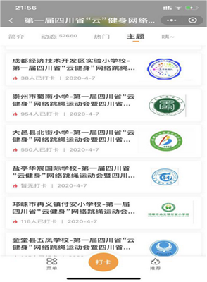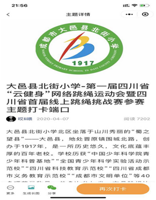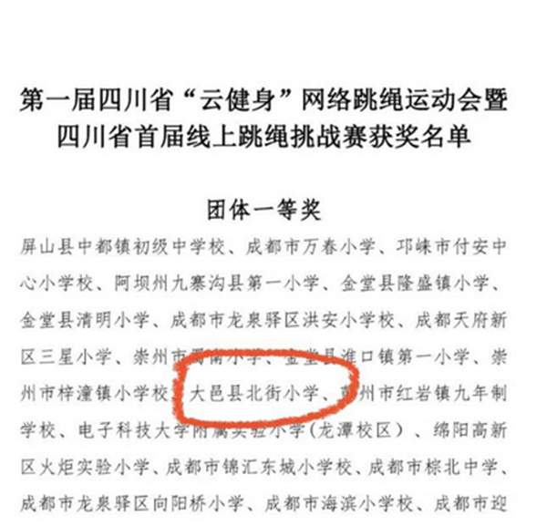 为深入贯彻四川省体育发展“123456”战略部署,在新冠肺炎疫情防控期间,鼓励居家锻炼和分散锻炼,因地制宜开展学生健身活动,促进学生身体健康。2020年4月7日-4月12日大邑县北街小学在四川省体育局主办的“云健身”网络跳绳比赛中获得团体一等奖。