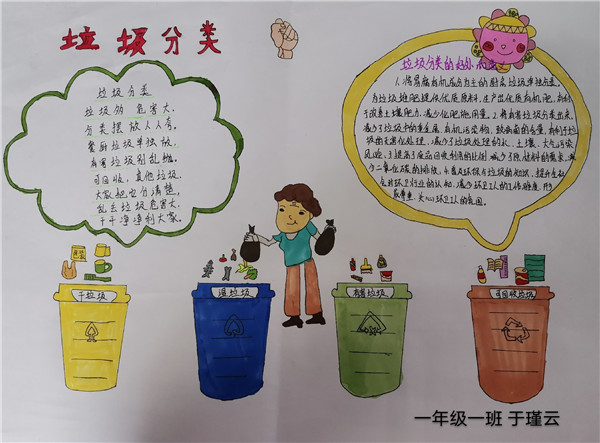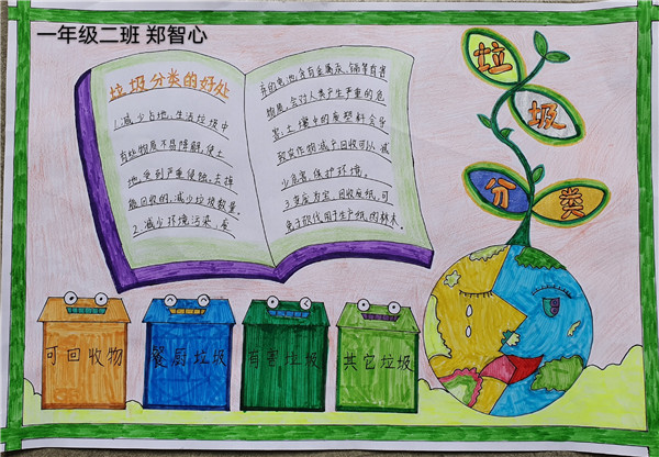 一年级中队辅导员组织学生和家长开展了亲子垃圾分类小报创作活动,爸爸妈妈们带领孩子通过电视、网络,学习了解垃圾分类的知识,用画笔和文字将垃圾分类的环保理念进行传递分享。