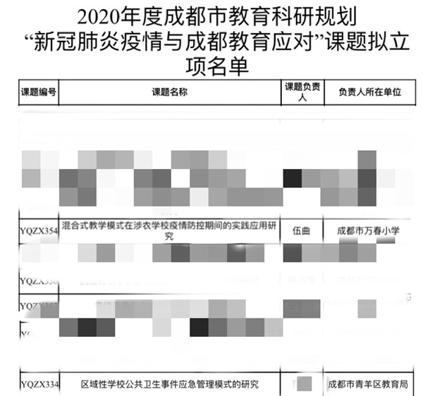 线上教学以来,万春小学积极参与成都市教育科研规划“新冠肺炎疫情与成都教育应对”专项课题的申报。学校校长刘芳菲和张冬雪教师参与的“区域性学校公共卫生事件应急管理模式的研究”成功立项。在课题组前期的努力下,学校副校长伍曲负责的“混合式教学模式在涉农学校疫情防控期间的实践应用研究”课题也成功立项。