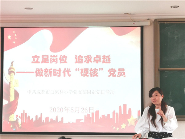 5月26日,成都市白果林小学党支部在多媒体教室开展了《立足岗位 追求卓越——做新时代“硬核”党员》固定党日活动。汤书记给党员教师梳理了本年度学校党支部2020年工作的五个重点,强调将“党建与责任、创先争优、师德师风建设、规范办学及立德树人”紧密结合在一起。
