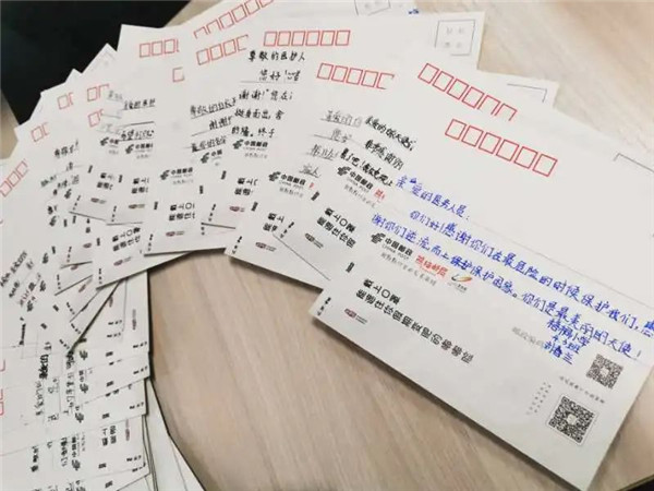 中国邮政将书写完后的明信片寄送至一线抗疫医院,由对应医院的医务工作者以明信片的形式回函学校。
