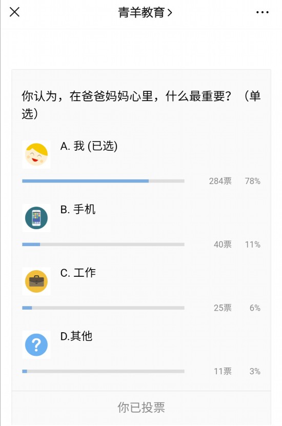 不过,对孩子来说,六一最快乐的除了玩具和玩耍,他们最渴望的应该还是父母的陪伴。来自青羊区的另一份调查,"你认为在爸爸妈妈心里什么最重要,70%以上的孩子选择了-"我"。
