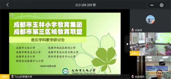 会议由成都市玉林小学副校长刘炜主持。“范敏名师工作室”全体成员在线下,成都市群星美术学校、成都市太平小学、新津县花源镇中心小学、成都市双流区胜利小学、成都市青白江区日新小学、简阳市普安乡中心小学的音乐老师在线上参与了本次教学研讨。