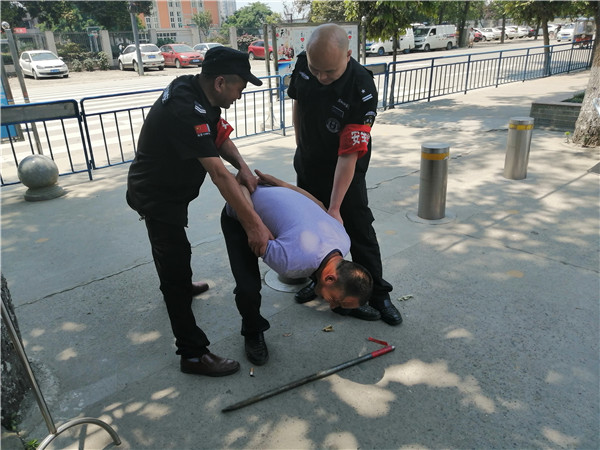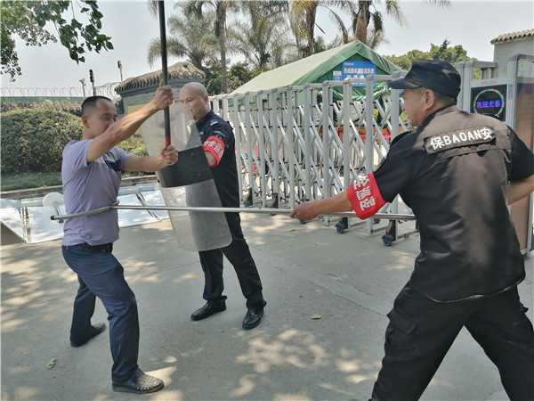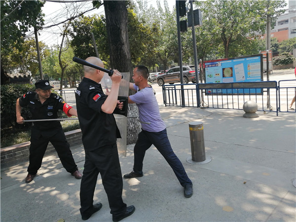 总务主任夏明毅对全体安保人员进行防暴知识培训,就盾牌、长棍、长叉、甩棍等安保器材的正确使用进行了详细讲解和示范;就特殊情况下安保人员的布局进行了合理分配与指导。最后,安保人员就所学的防暴知识进行了现场操作演练。