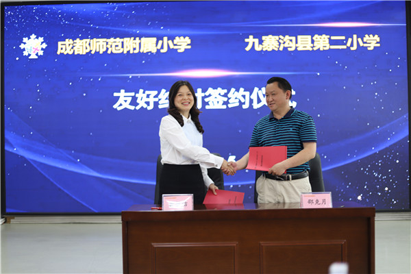 在友好结对签约仪式中,成师附小教育集团校长黄敏洁与九寨沟县第二小学校长邵克月分别代表两校在结对协议书上签字。