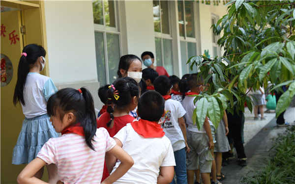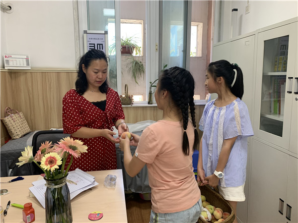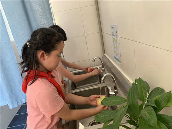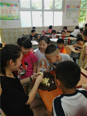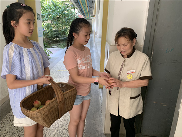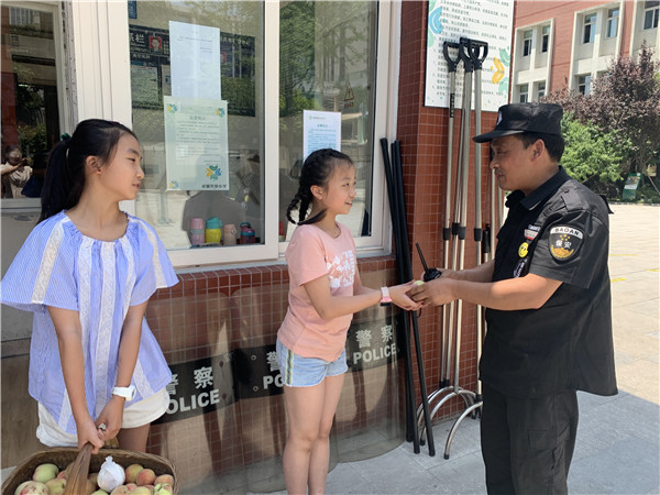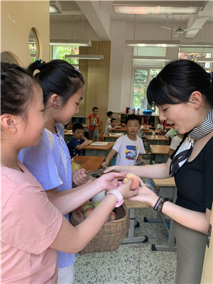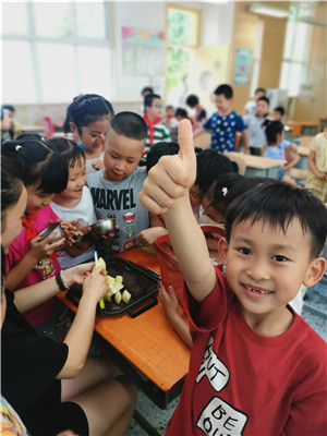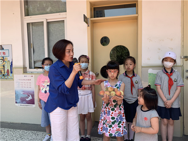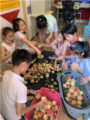 桃子摘完了,一筐筐、一篮篮被送到大队部。大委员们早就等在那里,开始计数和分配。“先给老师们送一个桃子吧!”“还有保安叔叔和保洁阿姨!”“还有我们的园丁邓叔叔!”一个个红扑扑还带着孩子们汗水的桃子被送到了校园守护者的手里,送到了亲爱的老师手里。用劳动的果实致敬光荣的劳动者,这是最好的劳动教育。