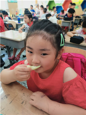 桃子被送到了各个教室里,与去年高产不同,今天的桃子产量减少,不够每人分一个。那就一起来分享。几个同学去清洗,几个同学端盘子,几个同学发手套,老师也来帮忙削桃子。你一瓣,我一瓣,大家有序领取,安静品尝,既享受丰收的喜悦,也珍惜减产的收获。