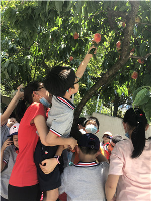 一年级的小朋友是第一次参加采摘节,他们雀跃着,激动不已。在五、六年级哥哥、姐姐的帮助下有序排队,到指定区域每人采摘一个,既体验摘桃的乐趣,又把机会留给小伙伴,是文雅的芳草娃。
