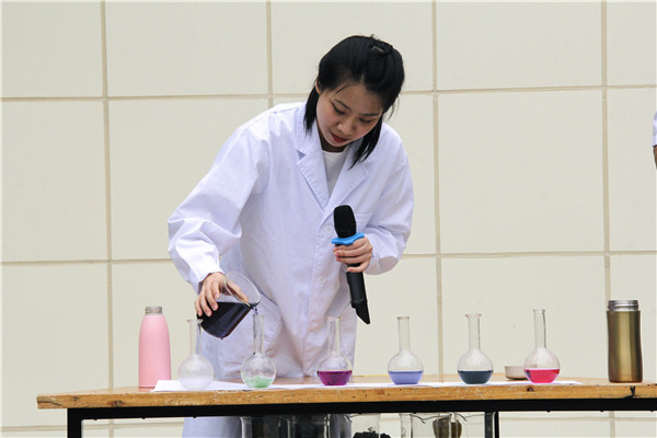 六一当天,三区科学老师化身为魔术达人,把科学元素融入实验之中,A、B区郭睿老师、蔡姗老师、江瑶老师、王媛悦老师、李亚芹老师、钟佳佳老师把紫色溶液倒入透明杯中,溶液就像有魔法一般,每杯溶液都改变了颜色。