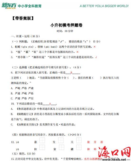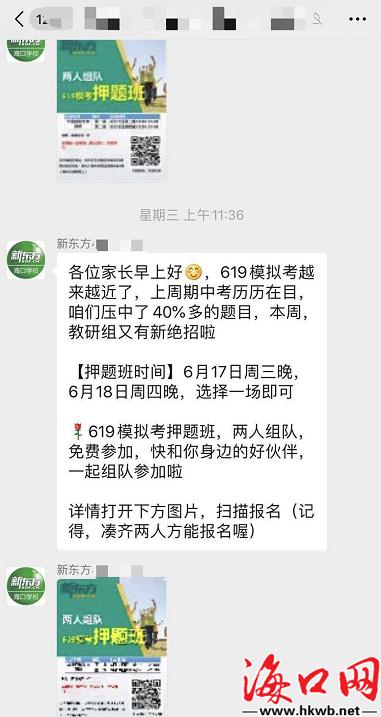 市民陈女士此前加入了一个小升初家长群。她回忆称,考前,群里就有新东方老师发布“押题班时间”活动。6月19日上午,语文科考试结束后,有家长把新东方海囗学校京华城校区的《小升初模考押题卷》发至群里,并称赞新东方押题很准,很多内容基本都一样。