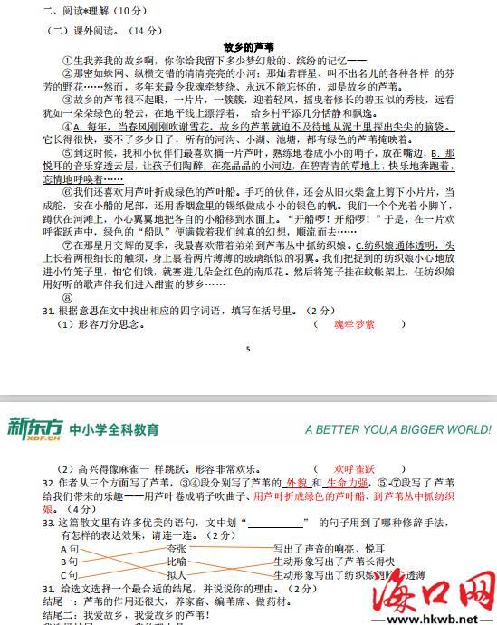 记者从陈女士展示的模拟考试卷(语文)与新东方押题卷中看到,新东方押题卷里的试题,如“积累·运用”里的判断题、选择题、填空题等题型内容与模拟试题几乎一字不差。