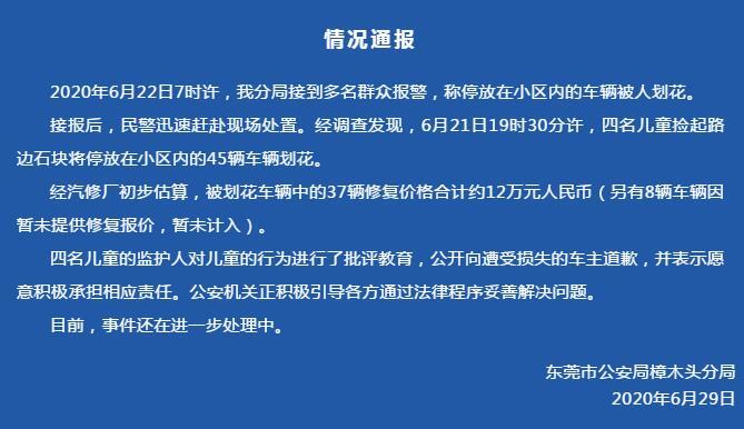 针对“有小区车辆被人划花”一事,东莞市公安局樟木头分局微信公众号29日发布情况通报称,经调查发现,四名儿童捡石块将45辆车辆划花,他们的监护人已公开向遭受损失的车主道歉,并表示愿意积极承担相应责任。