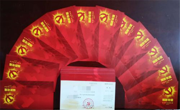 会议伊始,总支委员会委员任勇同志、刘磊同志和王冲同志将一张张印有中共中央组织部红色印章的捐款收据,郑重地交到每位参与自愿捐款的党员手中,这一张张带有精确编号的“红色收据”既见证了每位党员的赤诚初心,也体现了党组织对广大参与捐款的党员的温暖关怀。