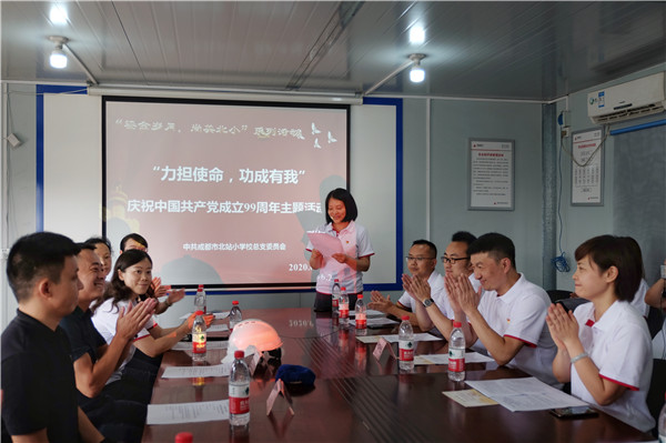为庆祝中国共产党成立99周年,深入学习贯彻党的十九大和十九届二中、三中、四中全会及2020年全国、省、市两会精神,激发基层党组织和党员队伍活力,为金牛区建区60周年献礼,6月27日,成都市北站小学在新校区开展了“鎏金岁月尚美北小”系列活动之 “力担使命,功成有我”庆祝中国共产党成立99周年主题党日活动。此次活动特邀新校区设计单位——北京市建筑设计研究院有限公司和施工单位成都建工第五建筑工程有限公司相关同志与全校在职党员教师一同参与。本次活动由北小党总支委员陈研老师主持。