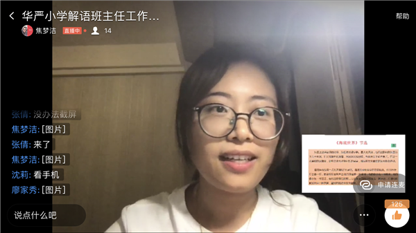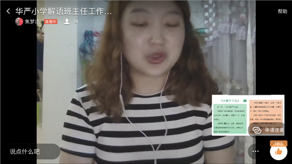 为展现教师风采,营造浓厚的校园朗读氛围,夯实教师朗读基本功,提高教师普通话水平,7月2日,成都市青白江区华严小学解语班主任工作室利用钉钉直播平台,开展了线上朗读比赛。焦梦洁主任为本次比赛的主持人,特邀彭涛副校长、廖家秀主任、刘晓燕老师、赵家蓉老师等担任评委。