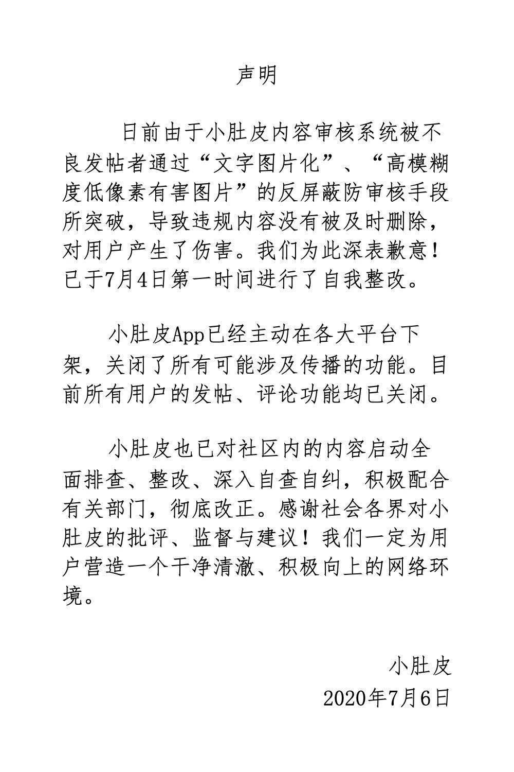 《声明》称,由于小肚皮内容审核系统被不良发帖者通过“文字图片化”、“高模糊度低像素有害图片”的反屏蔽防审核手段所突破,导致违规内容没有被及时删除,对用户产生了伤害。为及时改正错误,“小肚皮”APP积极配合有关部门,不仅已对社区内的内容启动全面排查、整改,还已主动在各大平台下架,并关闭了所有可能涉及传播的功能。