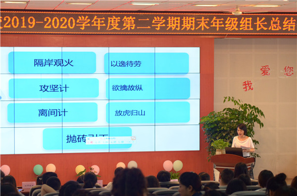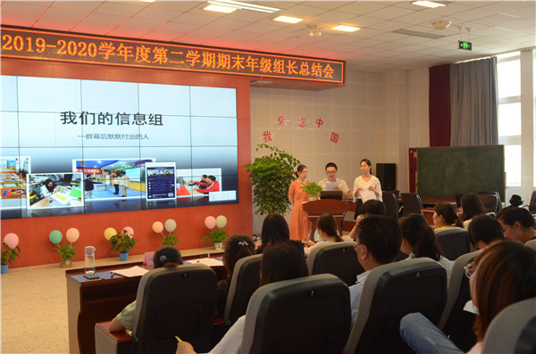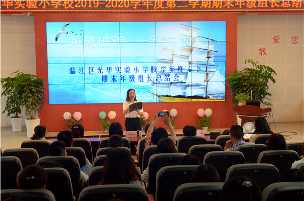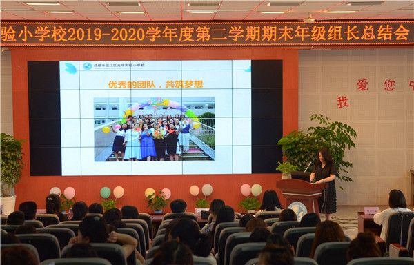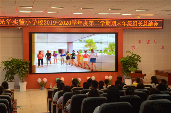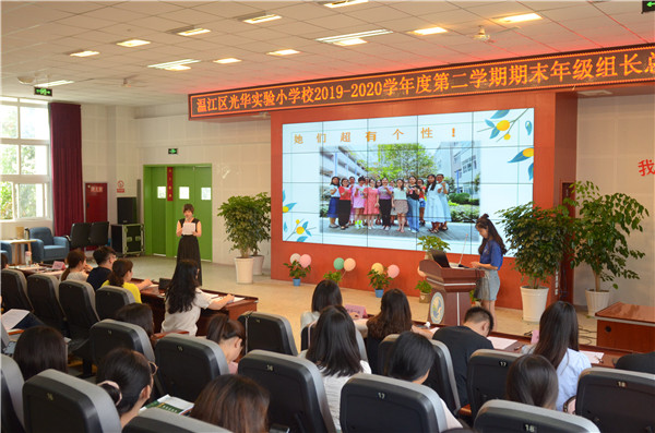成功伴随着艰辛,喜悦伴随着耕耘;走过往昔,奋斗的汗水刚刚拭去;回首征程,胜利的笑容正在蔓延;展望明天,我们携手同行。2020年7月6日,成都市温江区光华实验小学校的全体教师齐聚至美报告厅,参加年级组期末总结会,会议由德育处喻华主任主持,周丽校长带领学校行政领导和各年级组推选的老师一起作为总结会的评委,为各年级组的总结进行打分评比。