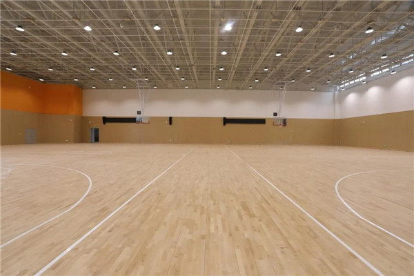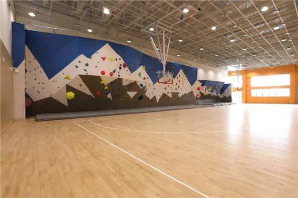 层高10米的室内体育馆,分为篮球和攀岩两大功能区。篮球馆采用减震运动木地板,不仅让学生能有最好的运动感受,更从物理上减少学生的运动伤害。