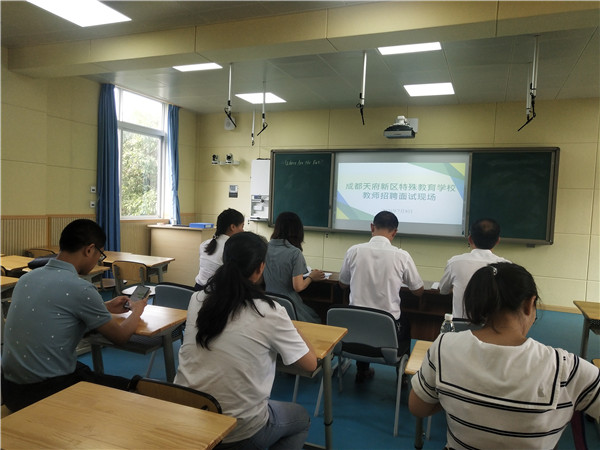 交流结束后,两校人员来到招聘面试教室,卞蓉校长受邀作为面试官全程指导、示范新教师面试工作,带领大家一起分析教师专业水平、适合岗位、可塑性等,为天府新区特校遴选优秀人才,为建设新校提供强有力的保障。青羊特校表示,期待与天府新区特校携手共进,共创特殊教育新征程。