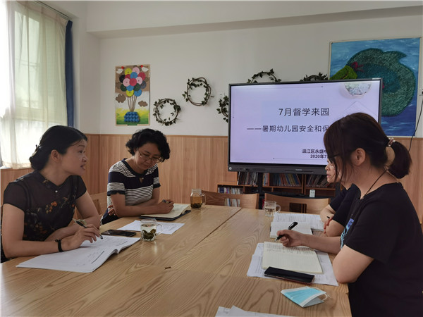 随后,赵园长对暑期安全措施、安全教育、家园联系、夏季幼儿保育工作、课题研究等方面开展的工作进行全面汇报。与此同时,陈督学查阅了相关档案资料,对幼儿园开展的一系列暑期安全工作和保育工作给予了肯定,也强调了在炎热的暑假,幼儿园要一切从实际出发,及时调整和安排夏季幼儿体育活动,确保幼儿安全和健康。
