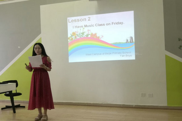老师们说课过程完整,环节清晰,从说教材、说学情、说目标、说方法、说设计、说板书等方面进行展示,学情分析到位,目标明确,重难点突出,教学方法设计得当,PPT设计新颖而具有创造性,板书设计简洁明了。说课过程中,老师们始终以学生的语言发展为目标,用一口流利的英语,丰富的手势语和体态语,通过巧妙的多媒体设计,运用互助式和创景式结合的学习形式,创设生动的语言教学氛围,激发学生的语言学习和交流的热情,培养学生的语言交际能力。