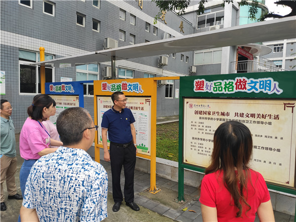 四、创卫工作得到上级部门的关心和指导。近日,崇州市教育局局长吕鹏、副局长赵强、副局长杨磊、德体卫艺科科长雷云、副科长杨科及市创卫办检查组等先后来到学校对创卫工作进行检查指导。吕鹏局长等领导在听取了学校创卫工作情况汇报,仔细查看了组卷资料,深入学校对教室、食堂、办公室、卫生间等进行实地检查后,对学校创卫工作中宣传氛围营造、校园环境整洁、组卷资料齐备等给予充分肯定,对学校创卫还存在的问题提出了详细具体的整改意见。