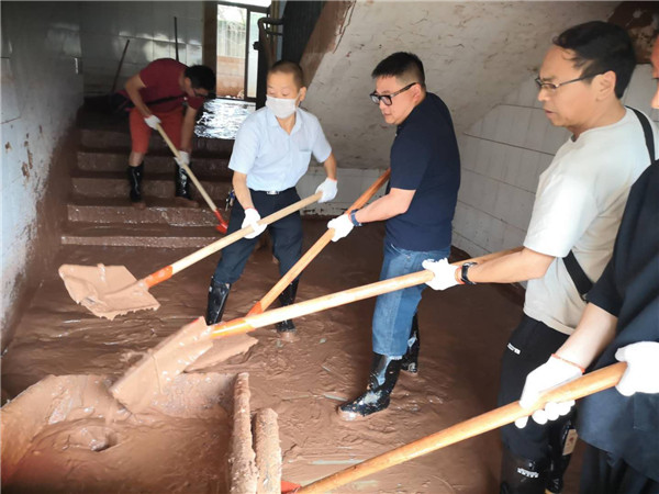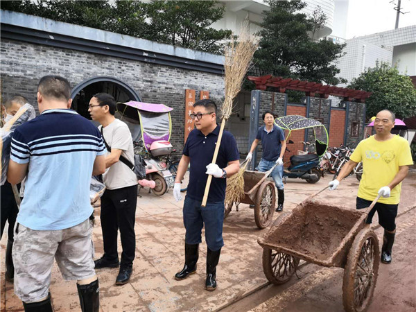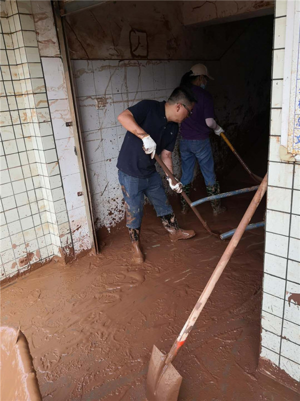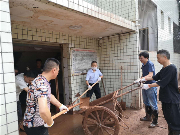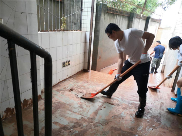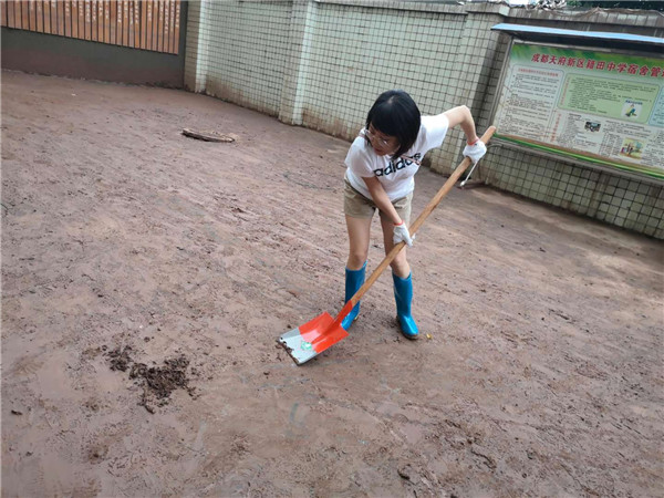 8月20日,成都天府新区煎茶中学组织全体行政及教师志愿者近20人,支援籍田中学开展灾后自救清淤工作。