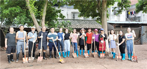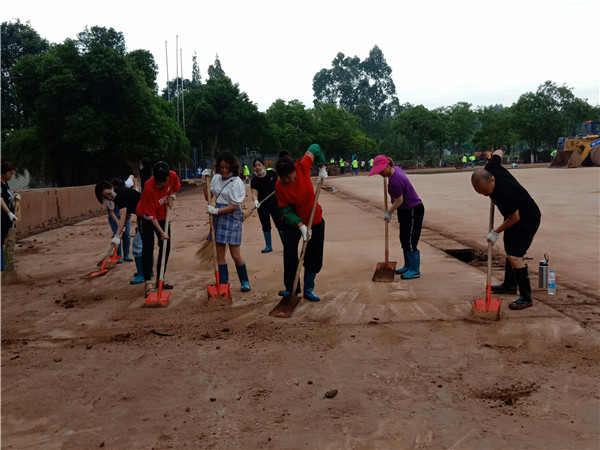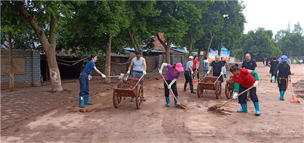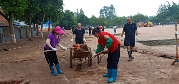 8月20日,成都天府新区永兴小学教职工在胡丰校长的带领下,自发组成了一支志愿者突击队,奔赴受灾严重的籍田中学北校区开展清淤工作。