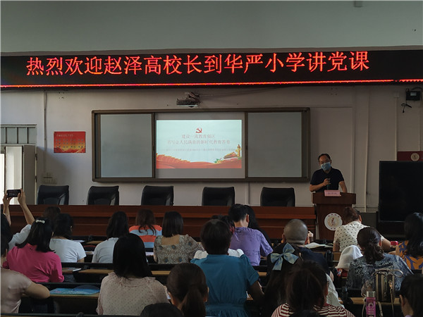 8月25日,青白江区教育局党组成员、大弯中学校长赵泽高同志在青白江区华严小学开展了主题为“建设一流教育强区,书写让人民满意的新时代教育答卷”的青白江区教育系统纪念建区60周年专题党课。会议由陈周民书记主持,华严小学全体教师积极参加。
