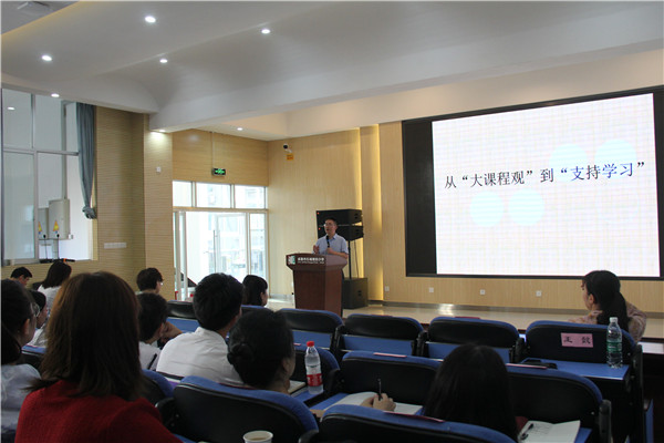 王琪做了题为《从“大课程观”到“支持学习”》的专题讲座,从多角度为老师们详细解读了我国的课改历程、“大课程观”和“支持学习”理论。
