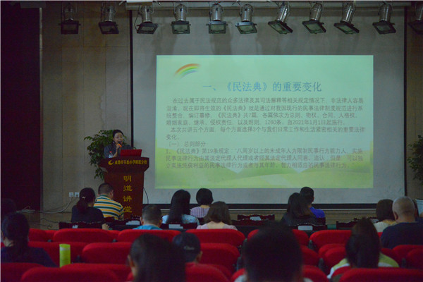 学期初开展学校法制教育有利于弘扬法治精神,培养师生的法制意识,丰富师生法律知识,8月26日下午,成都市实验小学明道分校(以下简称:实小明道)特邀四川兰上兰律师事务所的曾顺兰律师团队到校,为全体教师带来了一场法治专题讲座。