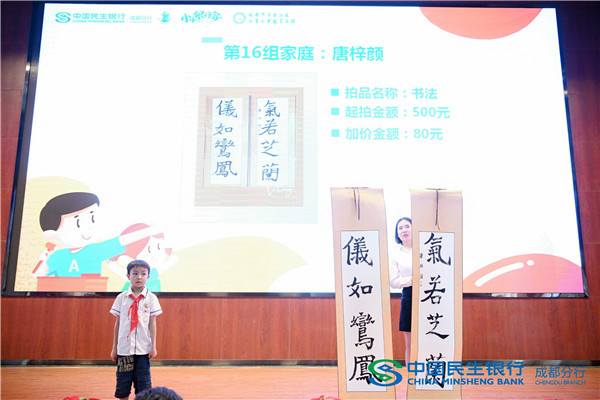 激动人心的拍卖会正式开始了,大弯小学的爱心使者们讲述着自己拍品的故事,热情的为拍品做“推销”,拍卖师则卖力地进行喊价,热情自信,又不失稳重,举手投足间都透露出专业拍卖师的范儿,台下参与竞拍的嘉宾、老师、学生也表现出极大的热情,争相举起手中的号码牌,竞拍自己喜爱的物品,大家互不相让,一次次将竞拍价格抬向高潮,好不热闹。其中4号家庭张语恬《西藏地图》拍品,将拍卖会现场气氛推向了最高潮,以1200元成交。最终,25件拍品拍卖所得的16937元,全部捐献给中国儿童少年基金会,用于成都市青白江区教育公益事业发展。