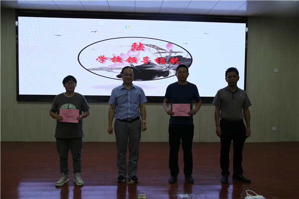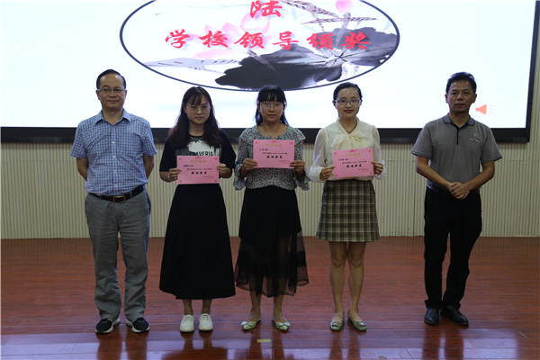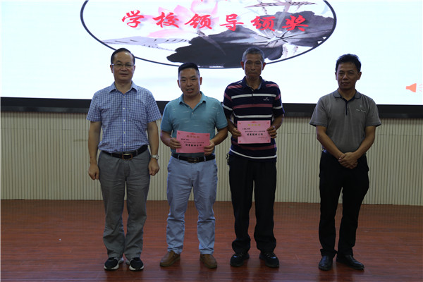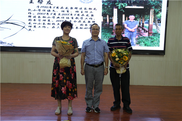 大会还举行了教师荣休仪式,主持人带着敬意介绍了吴清蓉、王帮友两位老师的事迹,校长亲自为两位老师献花,并合影留念。陈英副校长宣读了2019-2020学年度表彰决定,并邀请学校领导颁奖。