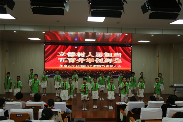 下午4:40,在孩子们充满温情的手语操表演中,一年一度的教师节表彰大会拉开序幕。全体教师齐唱国歌,校长刘万钧带来教师节致辞,从北宋儒学家张载的“横渠四句”谈起,再到习近平总书记对教师“四有”“四个相统一”“四个引路”的期望,最后谈到龙泉四小的成长——“生本,最美的遇见”,传递出一位校长对教育的情怀与追求!
