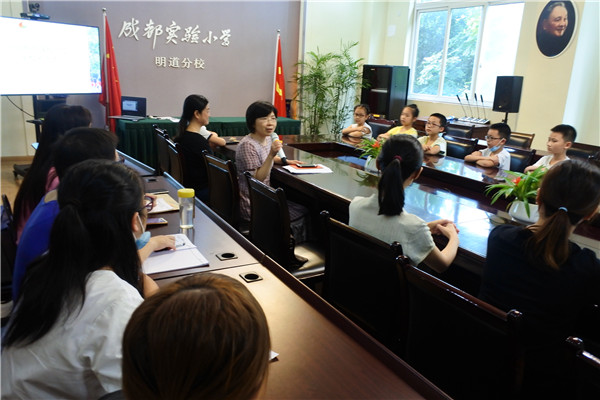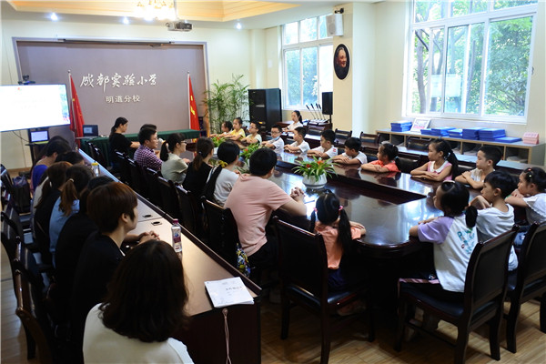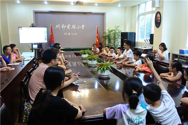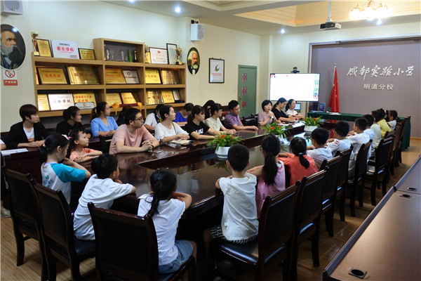日前,成都市实验小学明道分校(以下简称:实小明道分校)三年级五班班主任吴涛老师和家委会成员们共同策划了以“知秋”为主题的班级特色课程活动,取得了良好的效果。接着,三年级五班正式开启了“诵秋”活动,每天利用早读的时间由小老师带领同学们吟诵关于秋天的诗歌,孩子们在独特的班级“秋文化”当中学习。吴涛老师认为,老师和家长的付出要让孩子们真实感受到才具有教育意义。为继续深入推进班级特色课程建设,让孩子们感受到来自家长的智慧、爱与期望,体会到老师和家长的付出和不易,9月15日,一场特别的座谈会在明道会议室召开,参会者是三年级五班的老师、家长和孩子们。