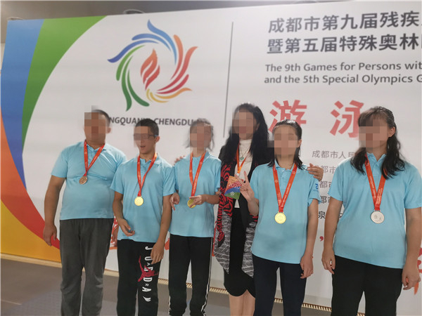 青羊特奥游泳队八名队员(张楚晖、陈义翔、曹润生、黄沿博、曾纪延、赵乙璐、涂艺曦、王夏睿妍)在领队卞蓉、教练王勇、李泌以及工作人员姜霞、张萍的带领下,摘得20金、2银、2铜的骄人成绩,本次运动会A组金牌14枚,成都市青羊区特殊教育学校(以下简称:青羊特校)运动员摘得A组金牌10枚,游泳项目奖牌与金牌总数均排榜首。