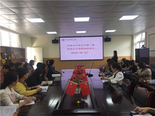 金秋九月,秋高气爽。9月22日,四川省第三届小学生诗词大会组委会走进崇州市学府小学,为学府小学全体语文老师带来一场培训。培训由副校长谢敏主持。本届诗词大会以“学诗词经典,演蜀风川韵”为主题,旨在弘扬中华优秀传统文化,提高小学生的文化自信和文学素养。