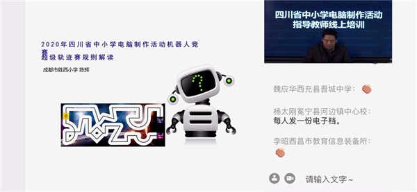 网络直播培训中,陈辉老师就机器人超级轨迹项目竞赛规则作了详细解读,并对省赛的具体操作提出明确建议。陈辉老师的培训得到了电教馆领导和市州听课老师们的高度评价。
