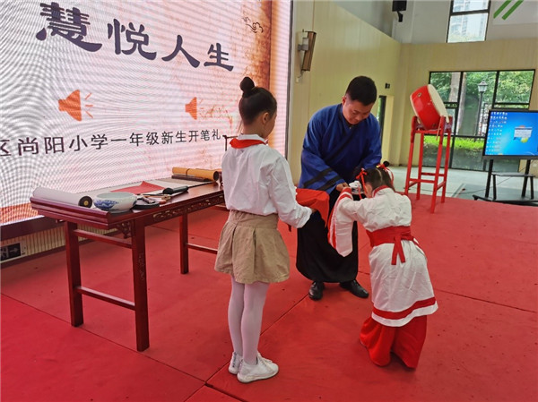 尚阳小学以古为经,以时代主题为纬,经纬交织,创新性地书写“开笔礼”篇章。本次“开笔礼”仪式包括“祭孔仪式”“开笔礼仪式”和“感恩礼仪式”三部分。通过庄重的仪式,刚入学的一年级小朋友真正感受到入学是人生中的一件大事,是学习的开始,是走向成才的起点,以此激励孩子们珍惜读书机会、勤奋学习,同时让其领略我国优秀传统文化的魅力,更好地传承中华优秀传统文化。